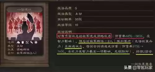 当你觉得自己队伍没有4回合秒人能力,而自己又很抗打时,可以用这个兵书,让十面埋伏变成38%概率发动,5回合时程昱又增加7%发动概率,这时十面埋伏有45%概率发动。