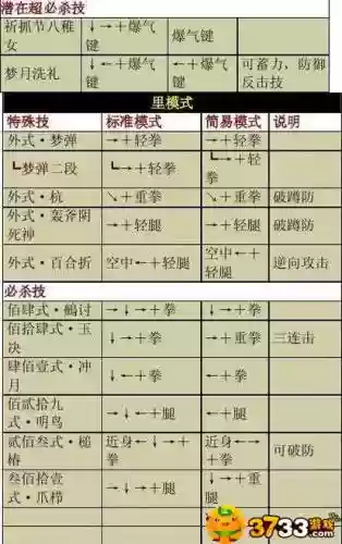 W、S、A、D分别是上、下、左 、右;J、K 、I、U分别是轻拳、轻脚、重拳、重脚;琴月阴: D、S、A加K或U ;后呦跟: D、S、D加J或 I;必杀八稚女:S、D、S、A 加 J 或 I;必杀过天标:S、A、S、D 加 J 或 I;秘籍: 无限鬼步。