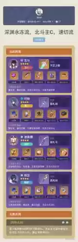 2、北斗+行秋+皇女+班尼特:主打感电输出,双雷元素共鸣加速能量循环,行秋开大,北斗站场输出,皇女、班尼特辅助。 北斗+砂糖+行秋+迪奥娜:北斗主c,迪奥娜提供护盾、回复,行秋、砂糖增加输出效率。 北斗+香菱+班尼特+皇女:双雷、双火元素共鸣,香菱、班尼特、皇女脱手输出,北斗站场。