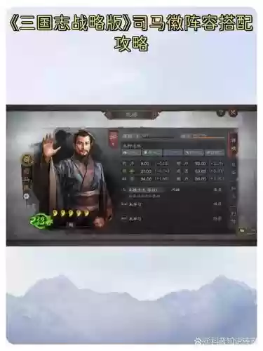 3、司马徽属于智力型武将,战斗能力其实一般,不过在前期开荒的时候可以用一用。下面带来三国志战棋版司马徽阵容介绍,各位小伙伴快来看看吧。