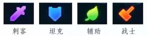 职业分为四种:刺客、坦克、辅助、战士,图标如下图所示。PS:可以这么记忆---长剑刺客、盾牌坦克、叶子辅助、锤子战士。