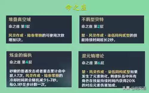 1.大招持续6秒,触发3次伤害,解锁2命后,持续8秒,触发4次伤害。如先挂元素后,即是风伤/扩散/转化伤害各4次。持续风伤10级倍率266%,元素转化10级倍率79.2%。如敌人挂上2种以上元素时,扩散还可以持续触发其他元素反应。