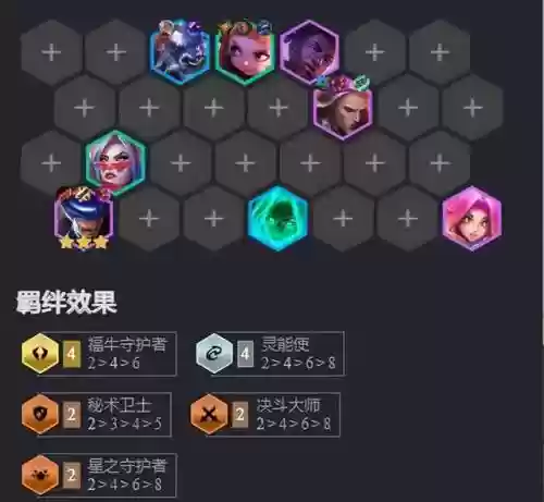 阵容组成由卡牌、安妮、妖姬、妮寇组成4灵能使,加上 剑姬、牛头、佛爷戈组成4福牛、2决斗大师,最后再上一个艾克组成2秘术卫士、2星守。